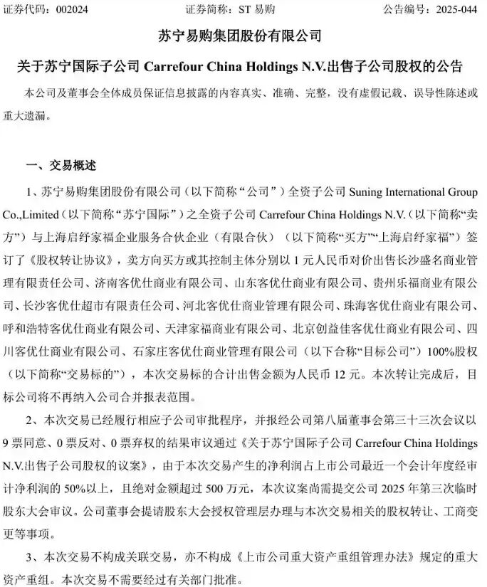 苏宁化债又有新动向。9月9日,苏宁易购(ST易购,002024.SZ)文牍,其全资子公司家乐福中国与上海启纾家福企业服务结伴企业订立了《股权转让公约》,前者向后者以1元对价,出售沙闻明买卖处分有限处事公司、济南客优仕买卖有限公司、山东客优仕买卖有限公司等12家子公司的100%股权,臆度出售金额为12元东谈主民币。