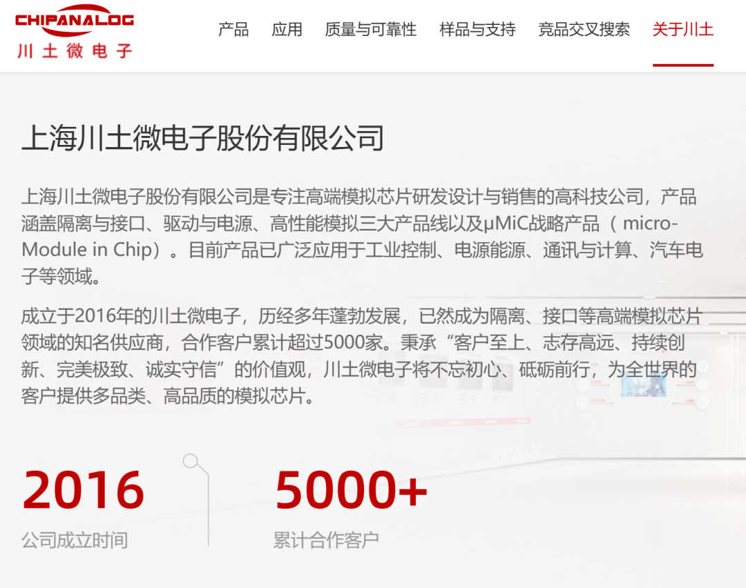 官网知道,川土微电子配置于2016年,是一家专注高端模拟芯片研发遐想与销售的高技术公司,产品涵盖破裂与接口、驱动与电源、高性能模拟三大产品线以及μMiC战术产品(micro-Module in Chip)。现在产品已庸俗行使于工业限制、电源动力、通信与运筹帷幄、汽车电子等界限,合作念客户累计跳动5000家。