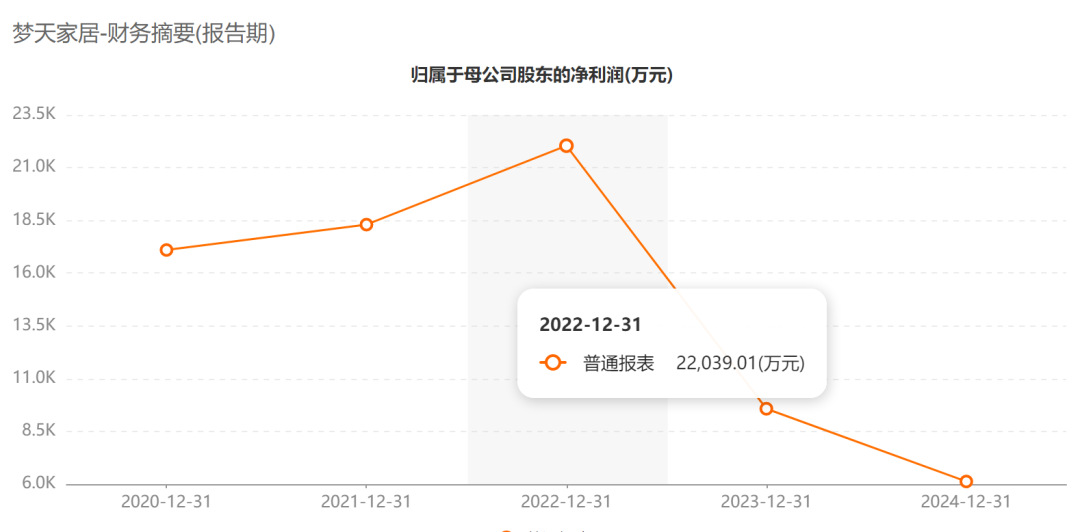 财务数据知道,梦天家居上市后事迹一起走低。2022年至2024年,公司商业收入从13.89亿元降至11.17亿元,归母净利润从2.20亿元降至0.61亿元。