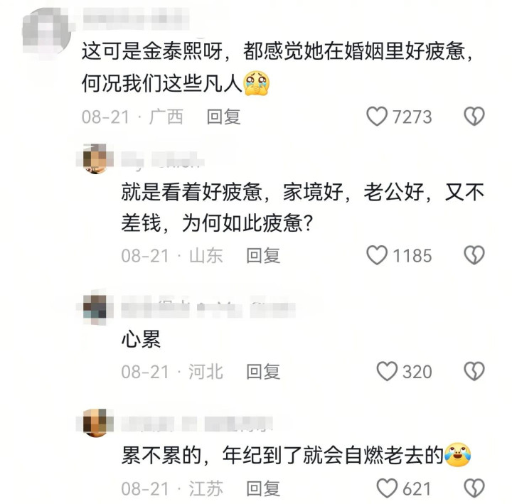 有网友批驳最近复出的金泰熙看起来好窘迫,感叹即使是家谈好、老公好、不差钱的金泰熙,在婚配里也如斯窘迫不胜。