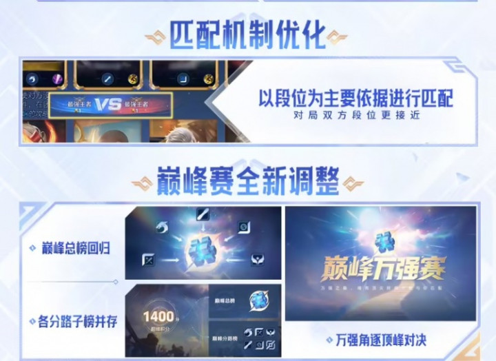 官方预热海报显现,《王者荣耀》S42新赛季匹配机制将优化,同期也对巅峰赛进行改换: