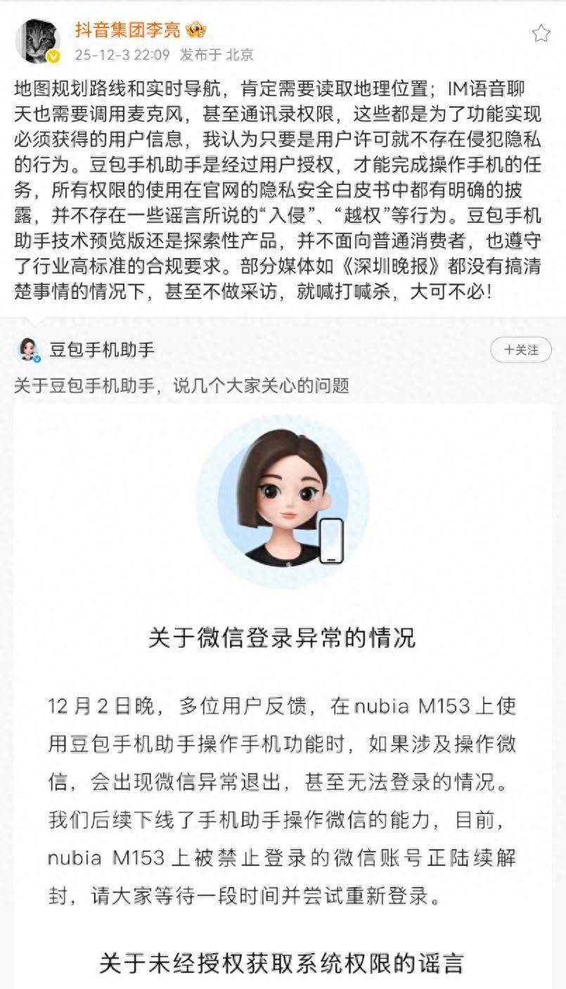 12月3日,抖音集团副总裁李亮转发了豆包手机助手官微的博文,进一步申报了豆包手机助手“未经授权取得系统权限”的传言。