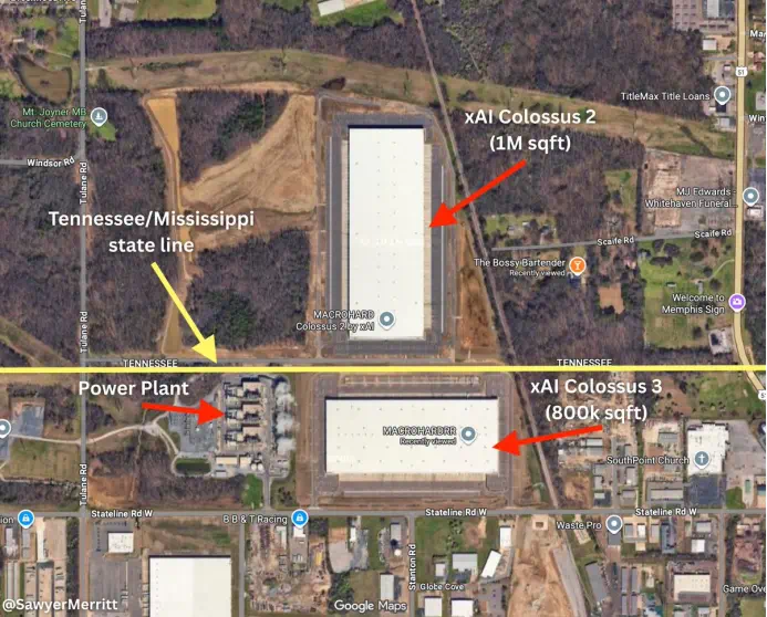 2026年1月,密西西比州长切身晓示,xAI在Southaven投资突出200亿好意思元,诱惑Colossus 3(也叫MACROHARDRR)。这里其实紧挨着Whitehaven,就在州界对面,与此同期,xAI在这里的一处旧厂址建了自然气发电设施——先是27台临时涡轮机,自后肯求扩到41台弥远,用来给Colossus 2和3提供补充电力。